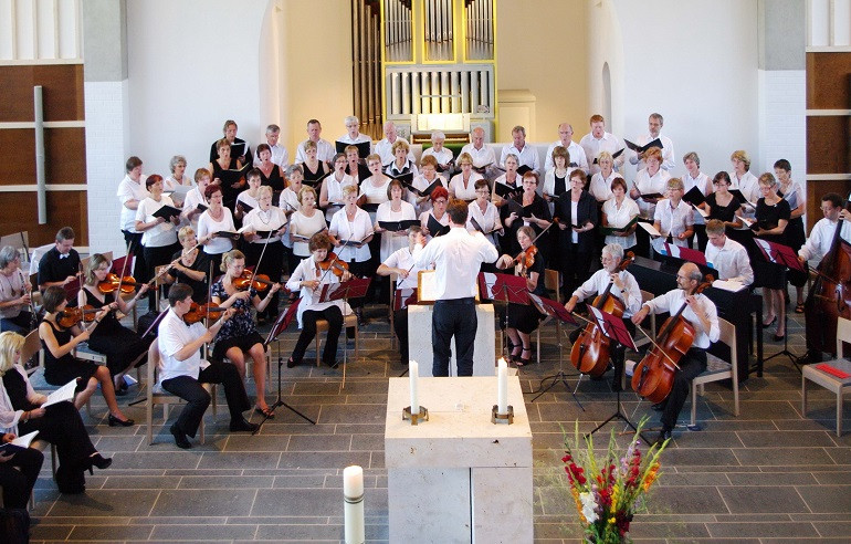 - so könnte das Motto unseres Kirchenchores lauten. Er besteht z. Z. aus ca. 40 Sängerinnen und Sängern. In den Proben bereiten wir unter der Leitung von Kantor Gerald Fink die Chorstücke für unsere Auftritte vor; dabei sehen wir in der regelmäßigen musikalischen Teilnahme an den Gottesdiensten unsere wesentliche Aufgabe.